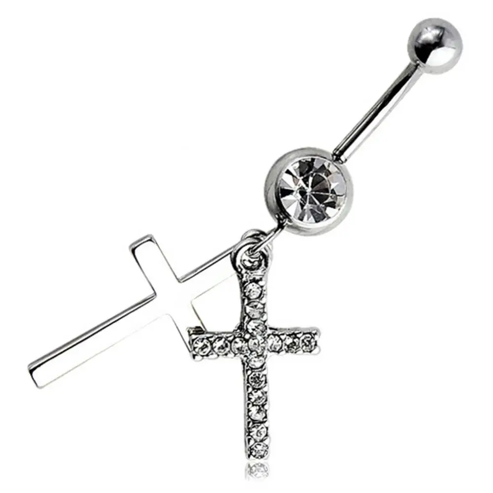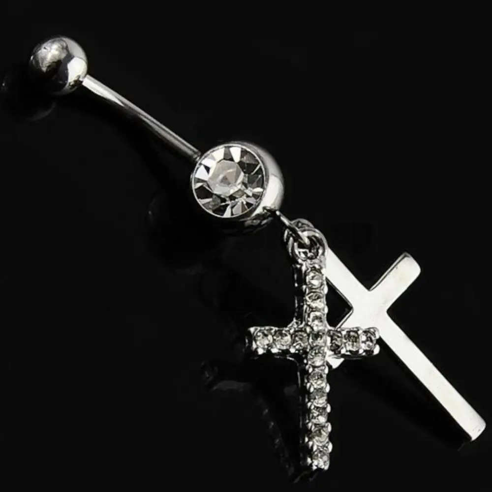 Rhinestone Double Cross Dangle Navel Belly Button Barbell Ring Body Piercing Jewelry
