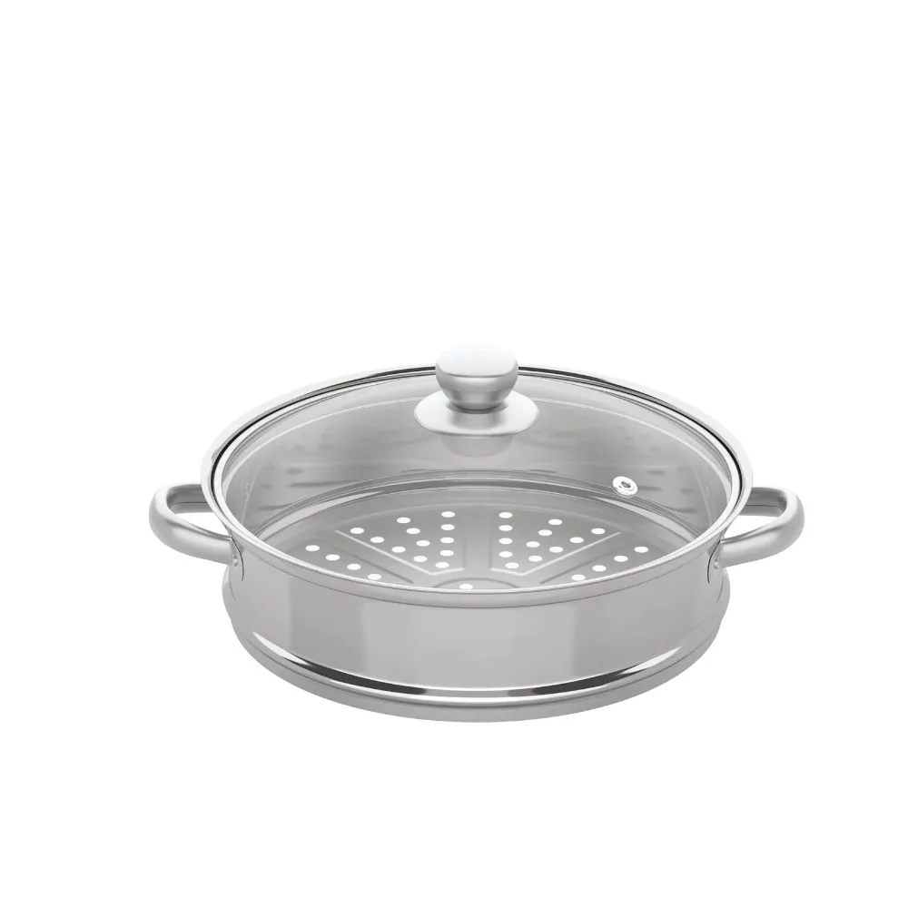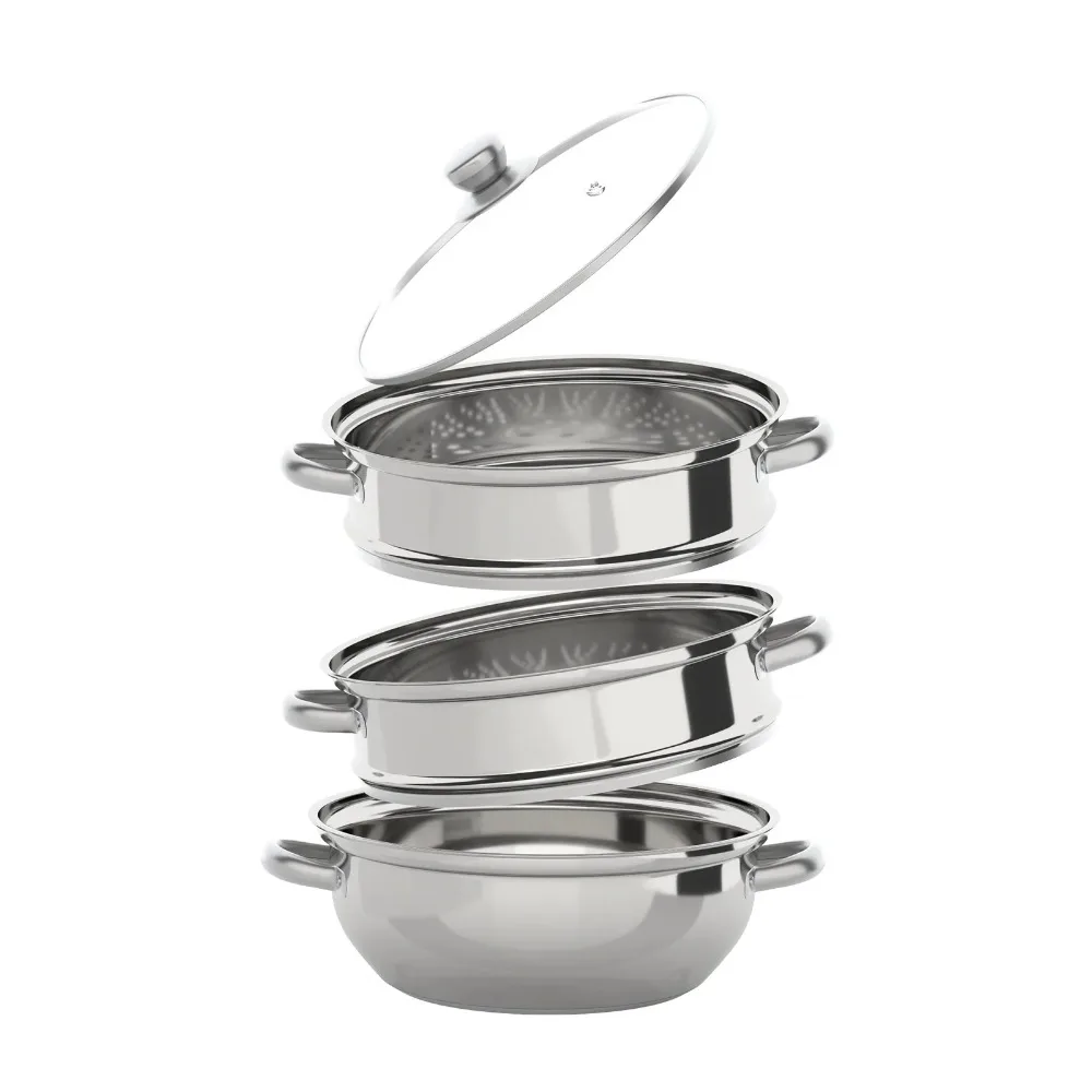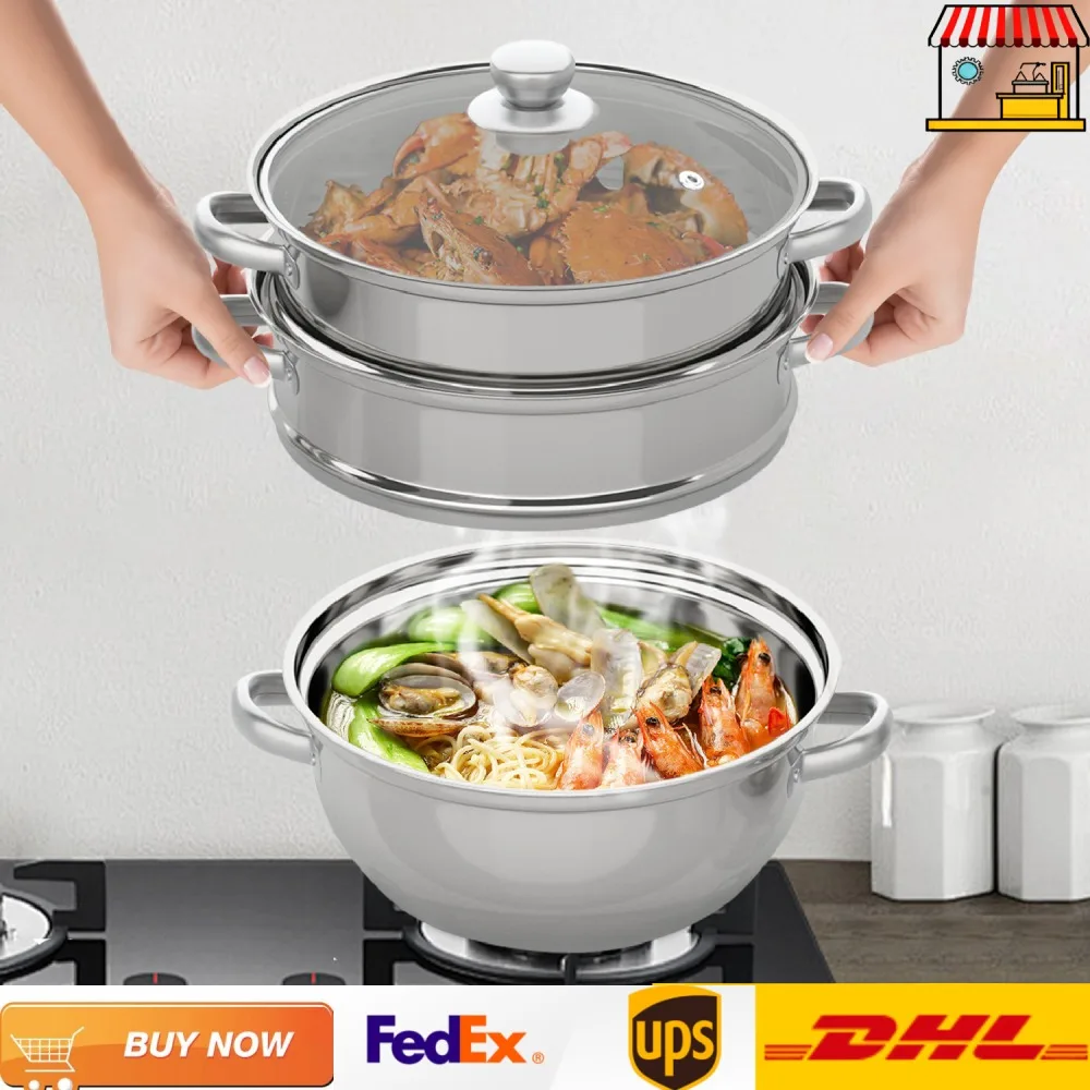 28cm 3-Layer Stainless Steel Steamer Soup Pot | Multi-Purpose Cooking Pot with Steaming Basket & Glass Lid
