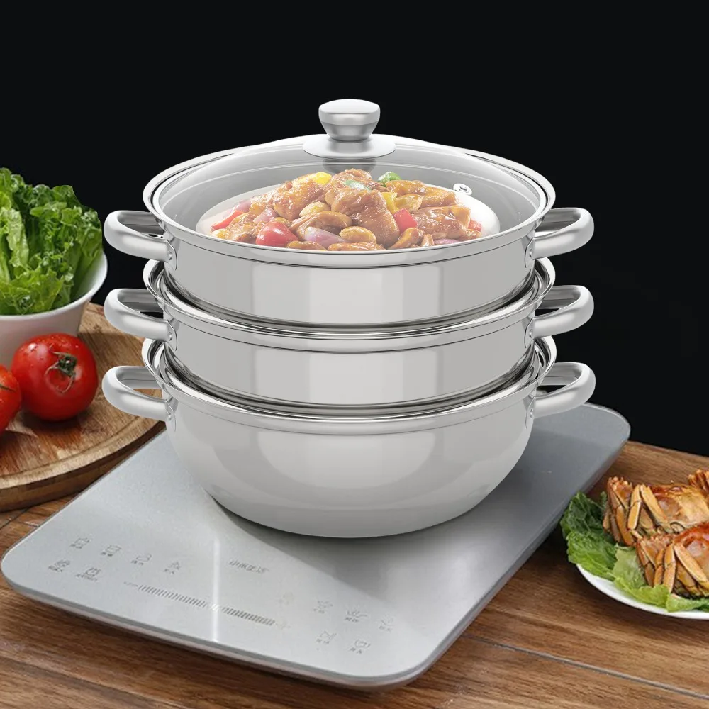 Strong Adaptability: Whether used on an induction cooker, an electric furnace, an electric ceramic stove or a gas stove, this 3-tier steamer can easily handle it.