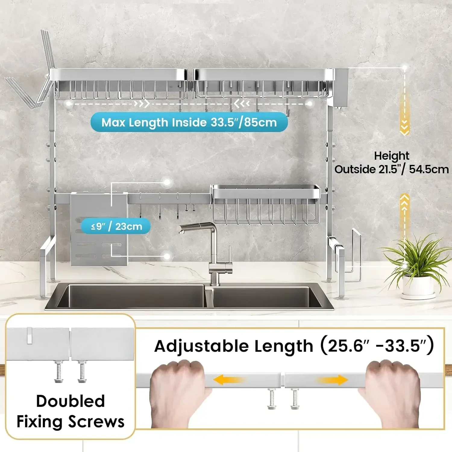 304 Stainless Steel Over-Sink Dish Drying Rack – Adjustable Length, Full Set with Hooks, Cutlery Holder & Tray