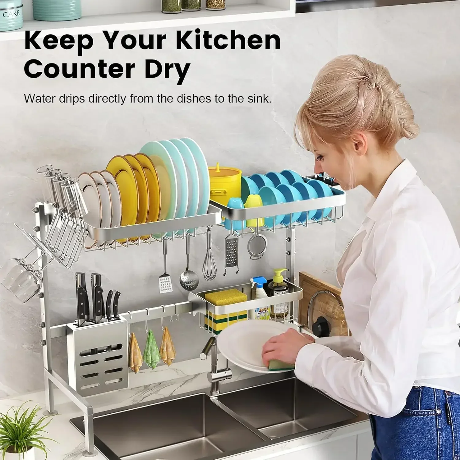 304 Stainless Steel Over The Sink Dish Drying Rack Length Adjustable Dish Drainer Full Set Dish Rack for Kitchen Sink Organizer Space Saver – Silver