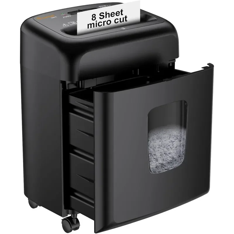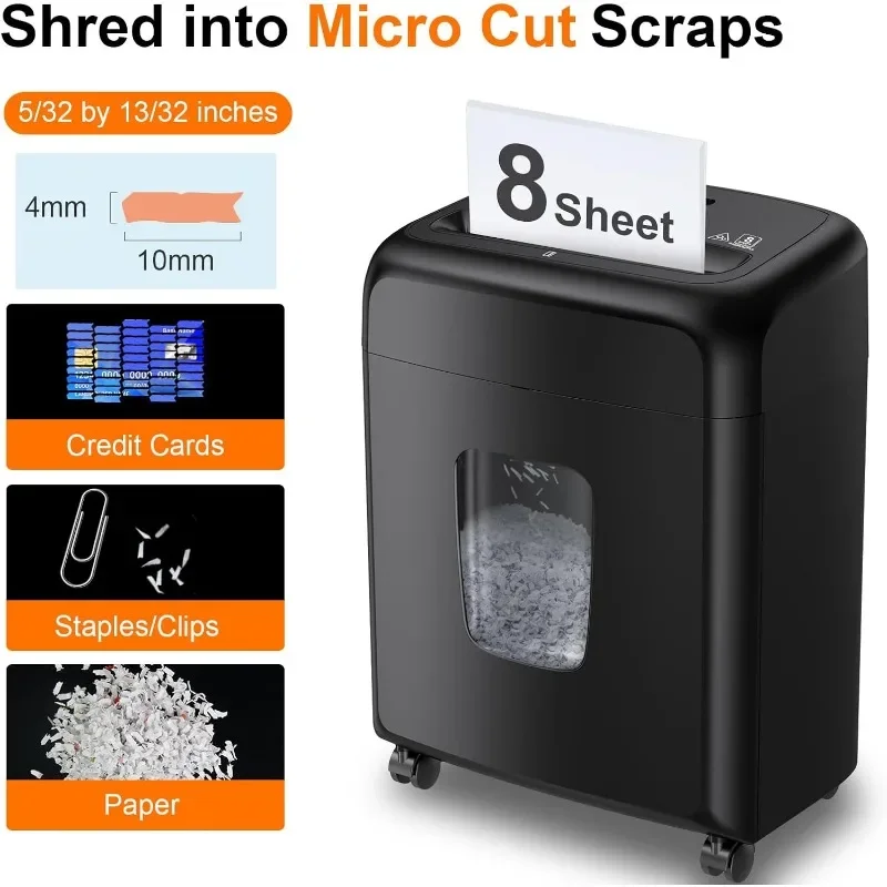 8-Sheet Shredding Capacity: This paper shredder for home can shred 8 sheets of paper (letter size, 75g/m²) at one time, also can shred credit cards (one at a time), staples, paper clips or documents (but not suitable for metal credit cards)