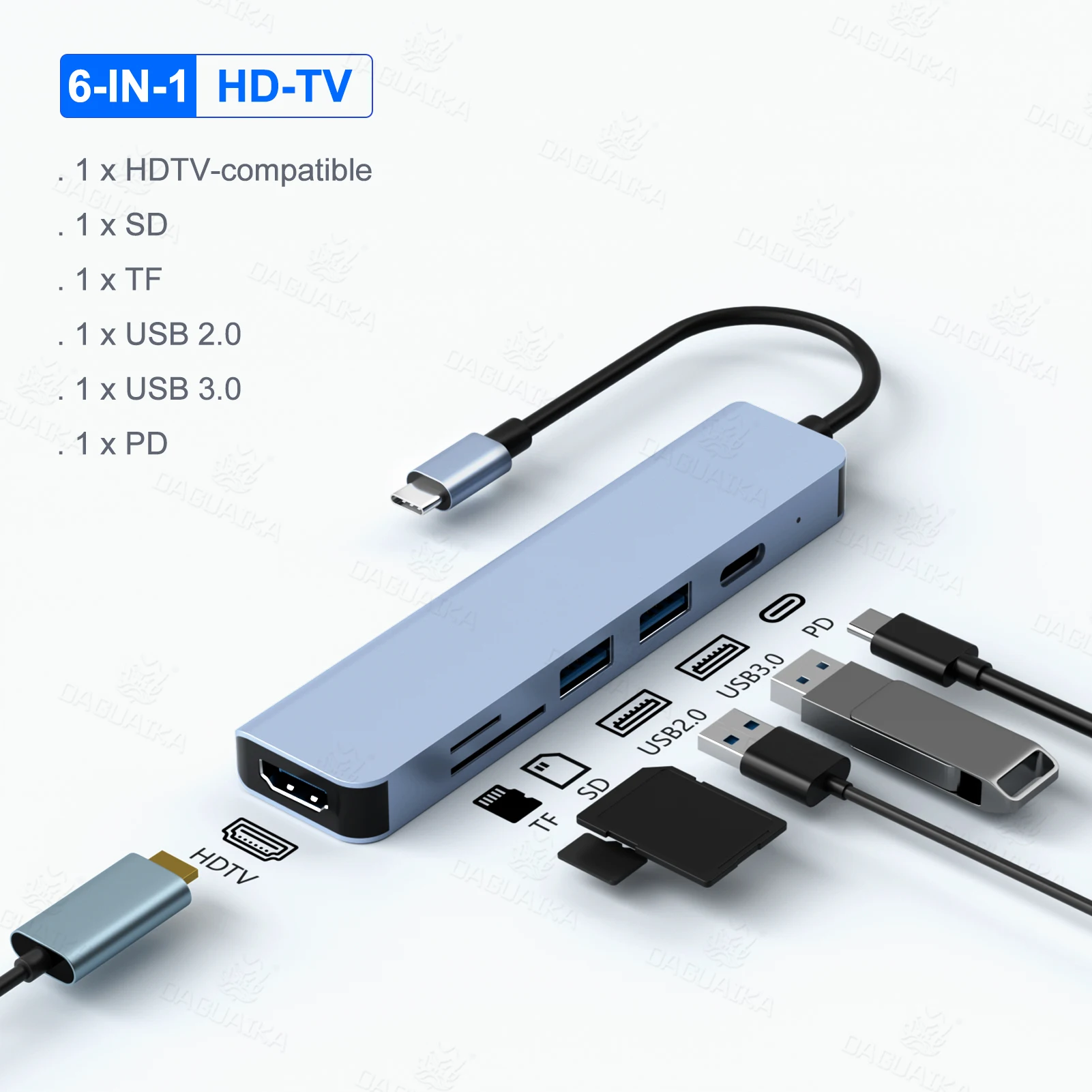 6-in-1 USB-C Hub Adapter, 4K HDMI, 100W PD, SD/TF Card Reader for Laptop