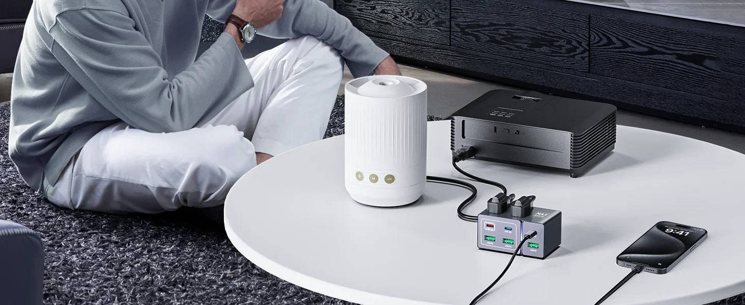 【Unique Design】The charging station for multiple devices with new GaN technology,GaN components waste less power and produce less heat,which results in a more efficient charge. The soft white indicator lights on the surface make it clear whether the power is on or off, and there are non-slip silicone pads on all four corners so that the power adapter can be placed stably on the desktop.