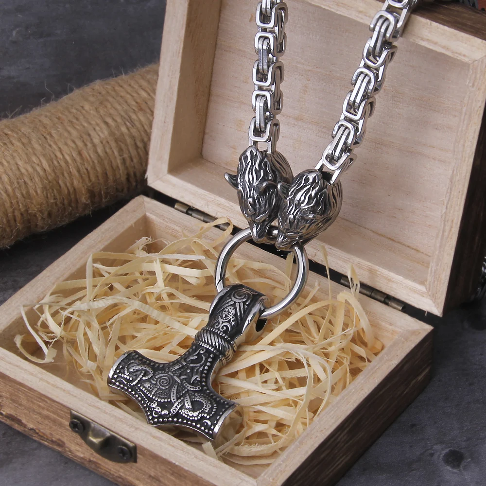 Name:Viking Thor Thor hammer pendant necklace titanium steel wolf head chain necklace Viking Retro jewelry