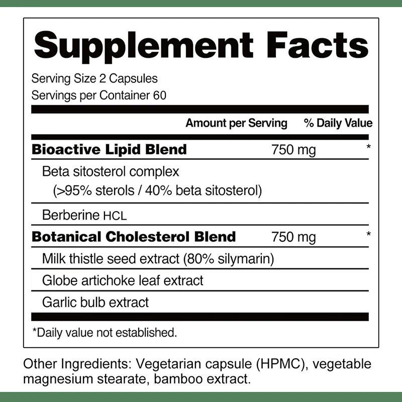 Berberine helps lower LDL (bad cholesterol), increase HDL (good cholesterol), and lower triglycerides. Garlic has natural lipid-lowering, blood pressure-lowering and anti-platelet aggregation capabilities, which are beneficial to cardiovascular health. Artichoke can stimulate bile secretion, promote lipid metabolism and cholesterol removal.