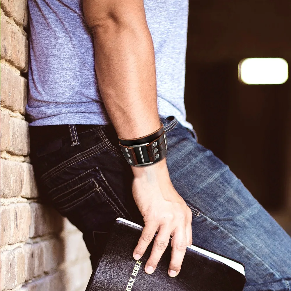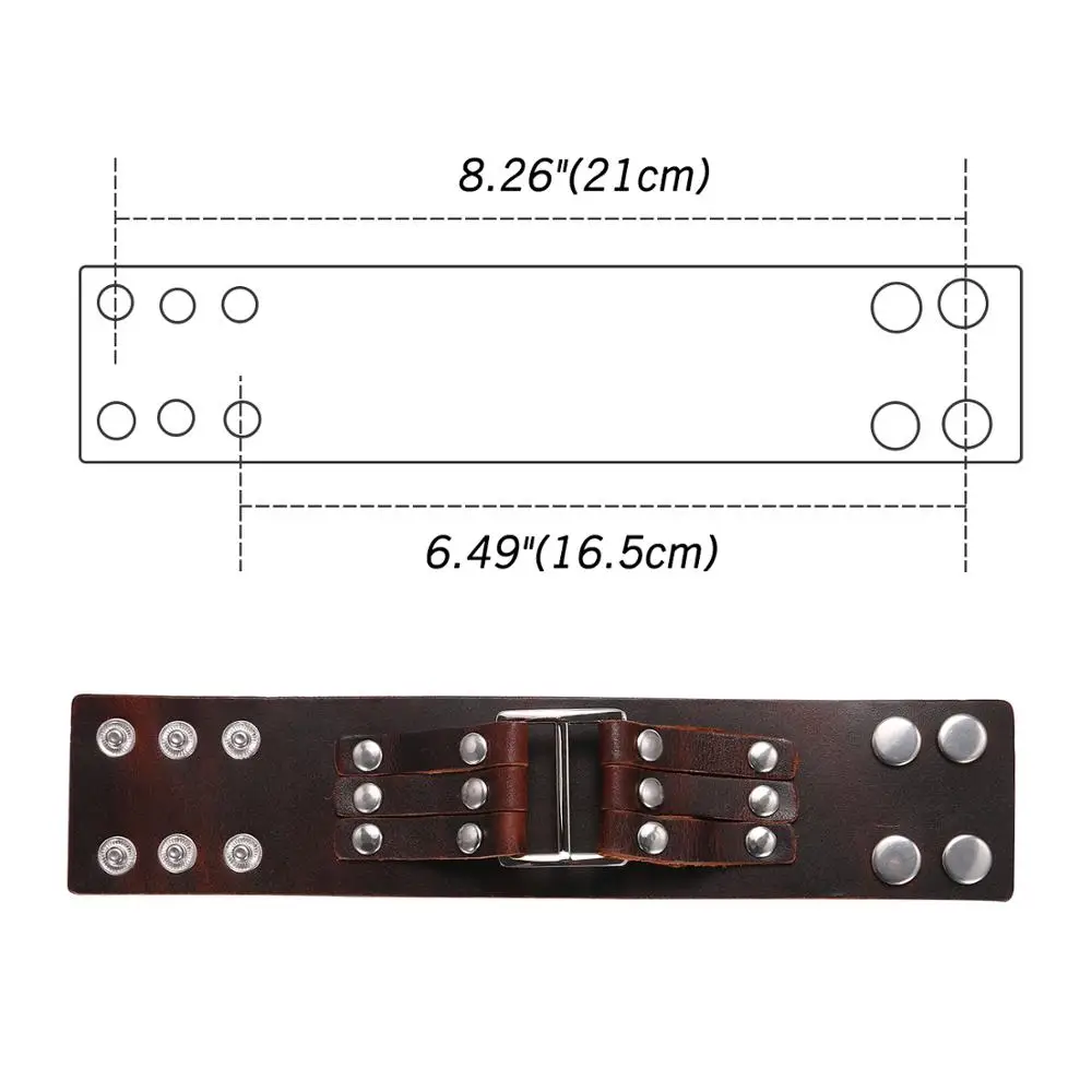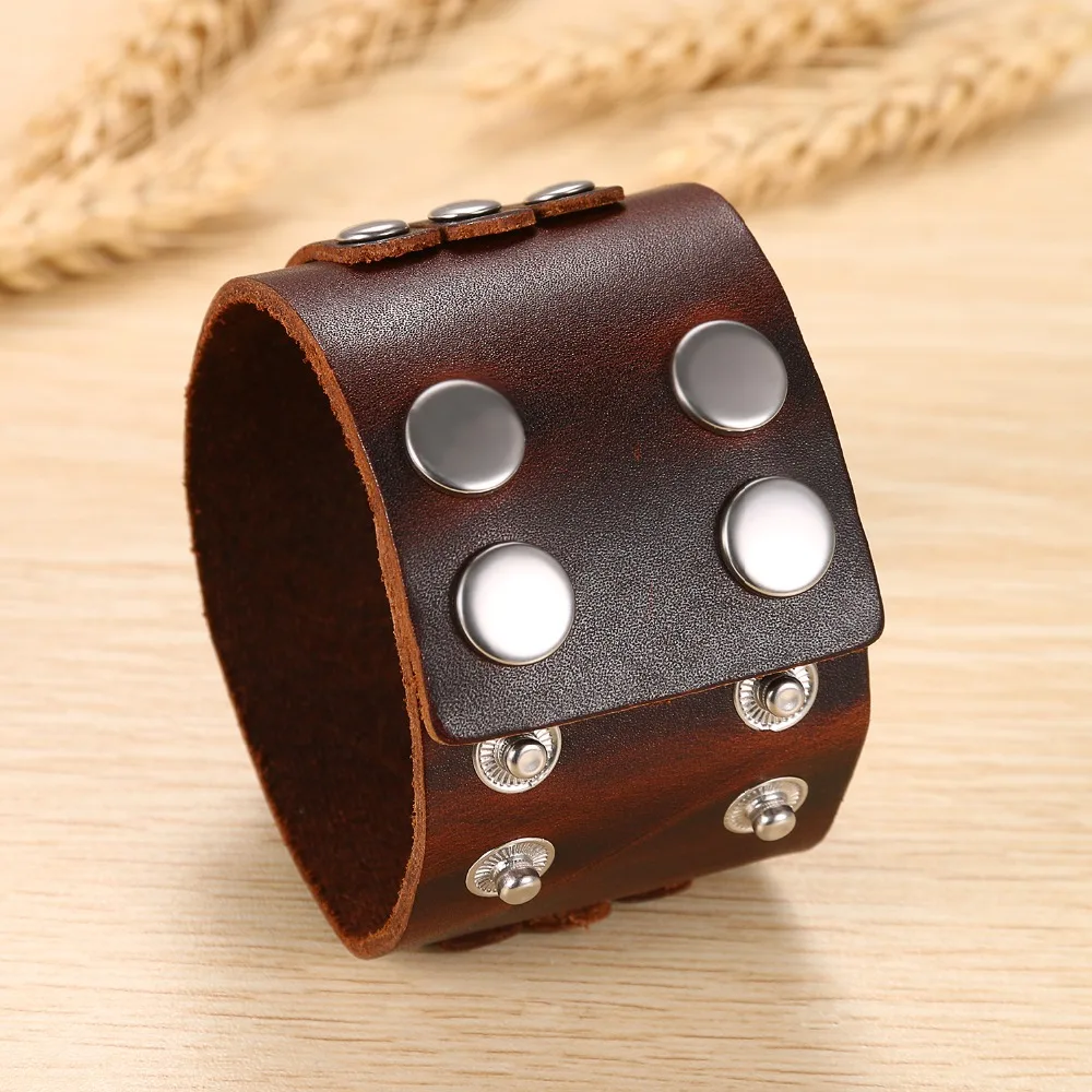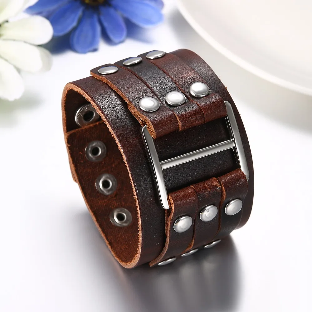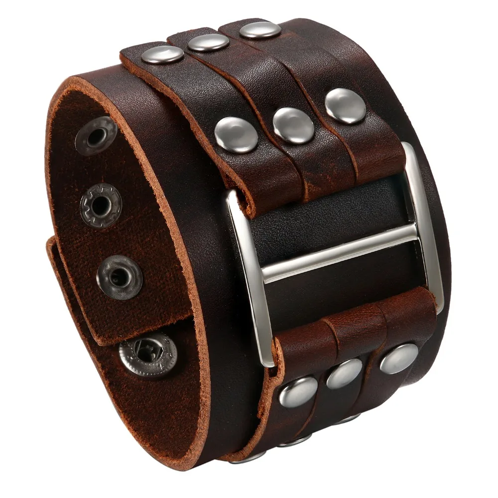 BONISKISS Cool Style Wide Big Buckle Rivet Genuine Leather Bracelet For Men and Women Adjustable Cuff Wristband Bracelet Bangle