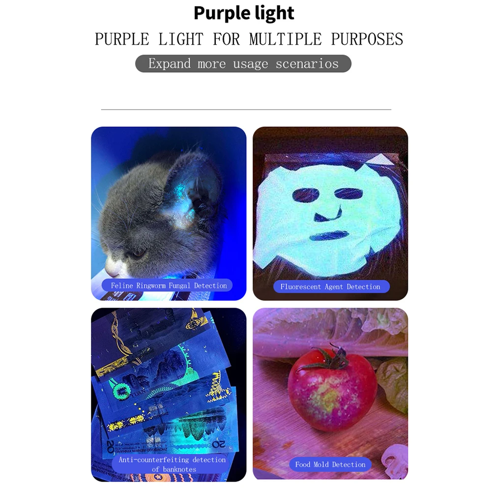 Side light 3 gears: 3*LED white light strong light-3*LED white light weak light-3*LED white light flashing, long press to switch to side light 2*LED purple light