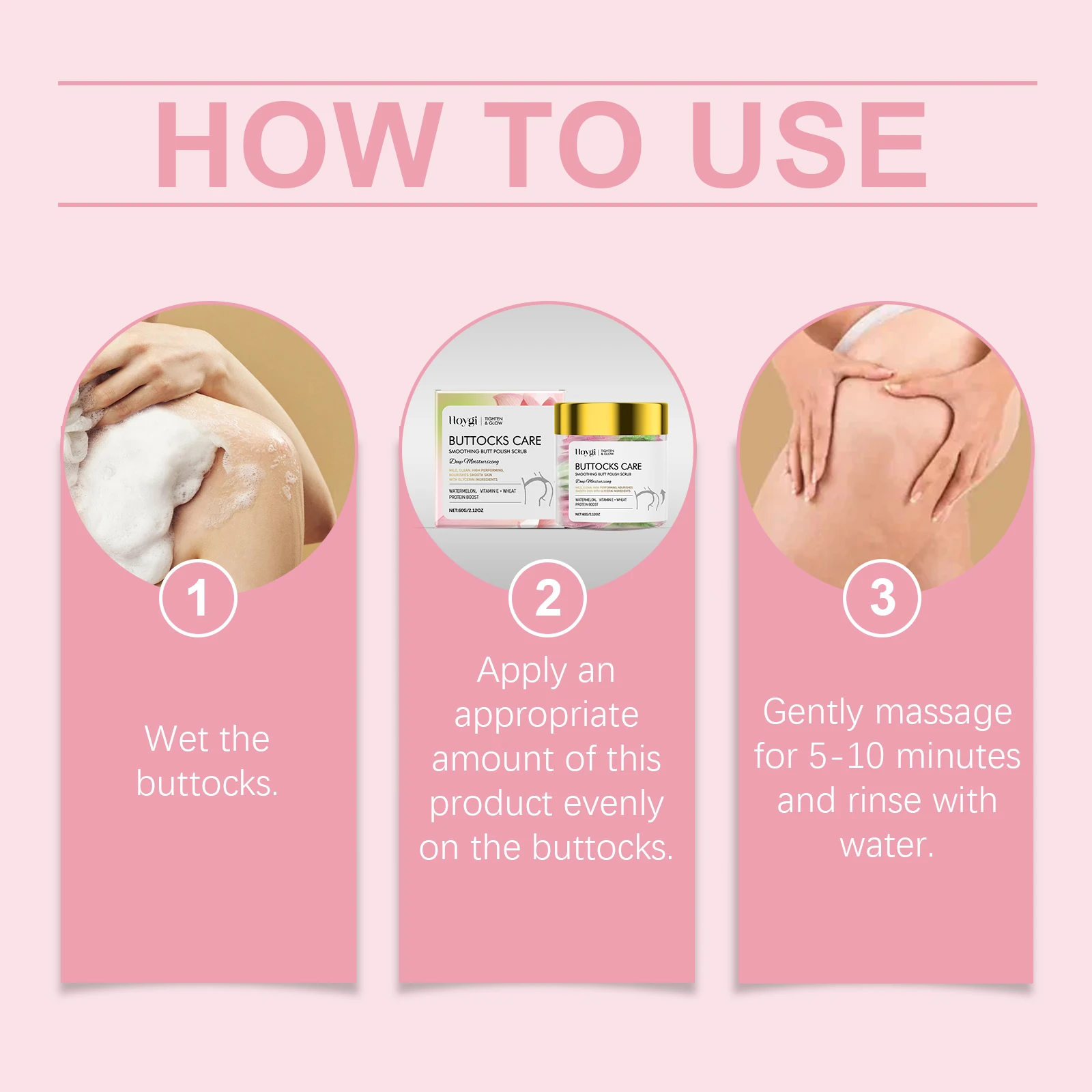 2. Apply an appropriate amount of this product evenly on the buttocks.