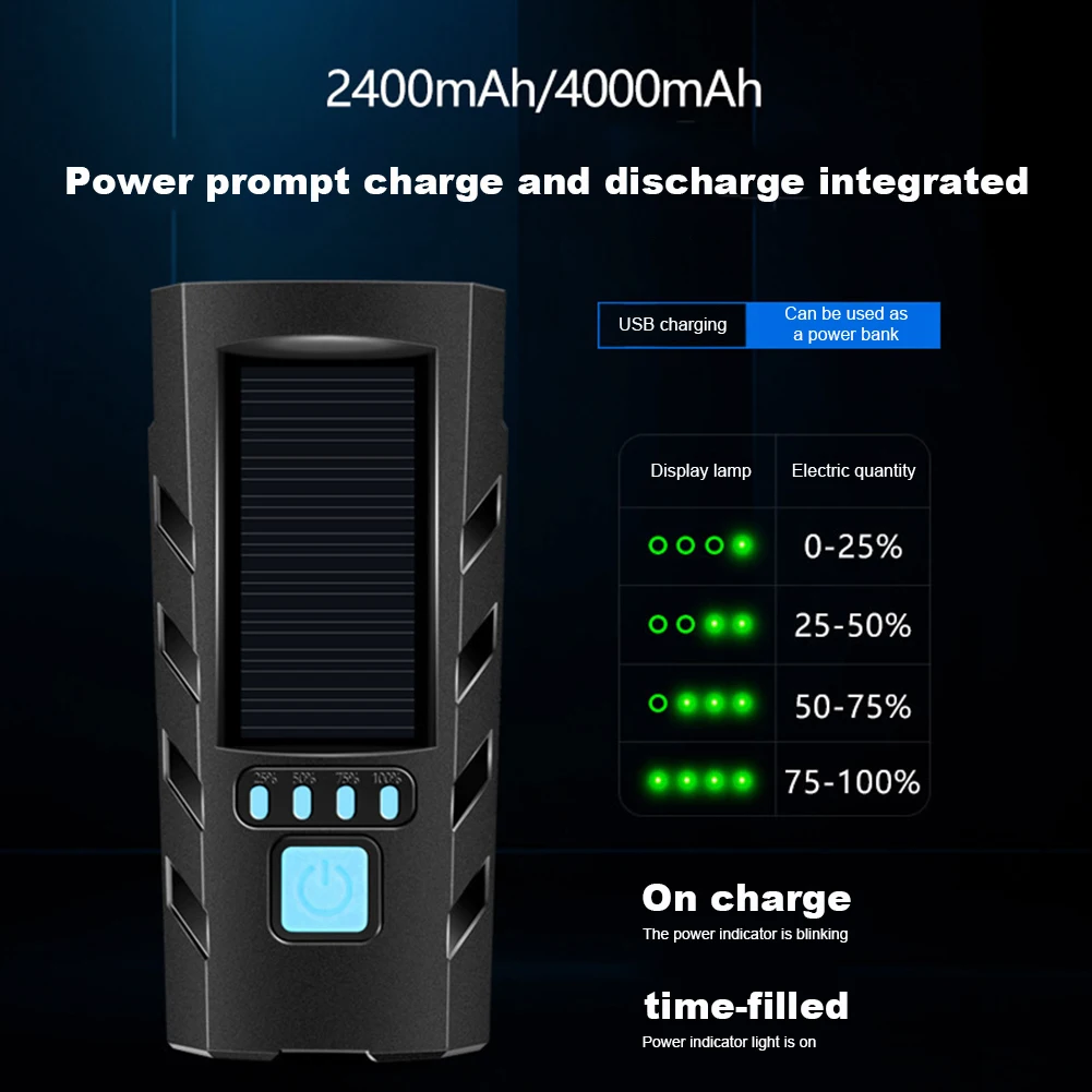 1. Dual Charging Modes: Enjoy uninterrupted rides with our bike front light’s dual charging options. The solar-powered feature ensures eco-friendly energy collection during the day, while the USB charging capability provides a convenient power-up at night or on overcast days, guaranteeing long-lasting illumination.