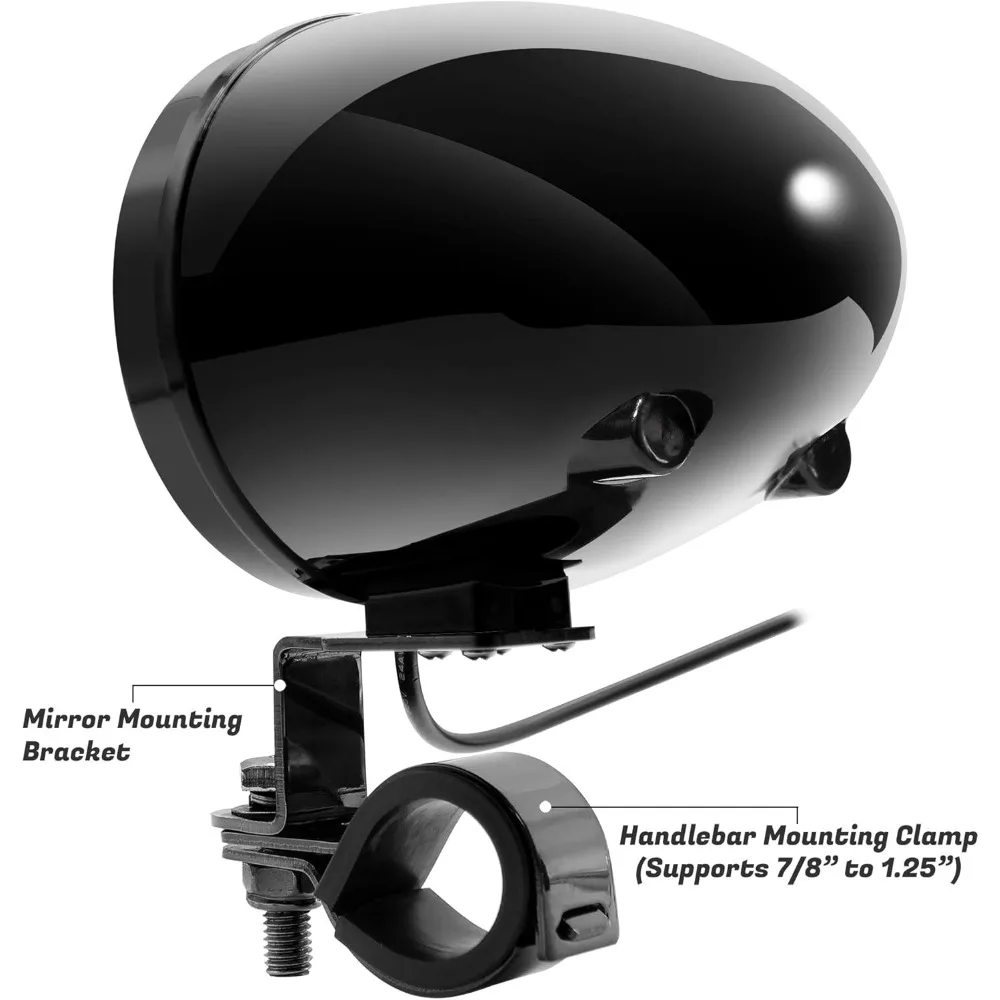 2-Channel 180W Full Range Motorcycle Speakers with Aluminum Stereo Main Unit. High Performance Amplifier Built-in. Speaker Clamp Universal fit for 7/8 to 1-1/4″ handlebar. Mirror mounting bracket included. Support Bluetooth Wireless connection up to 15 meters.