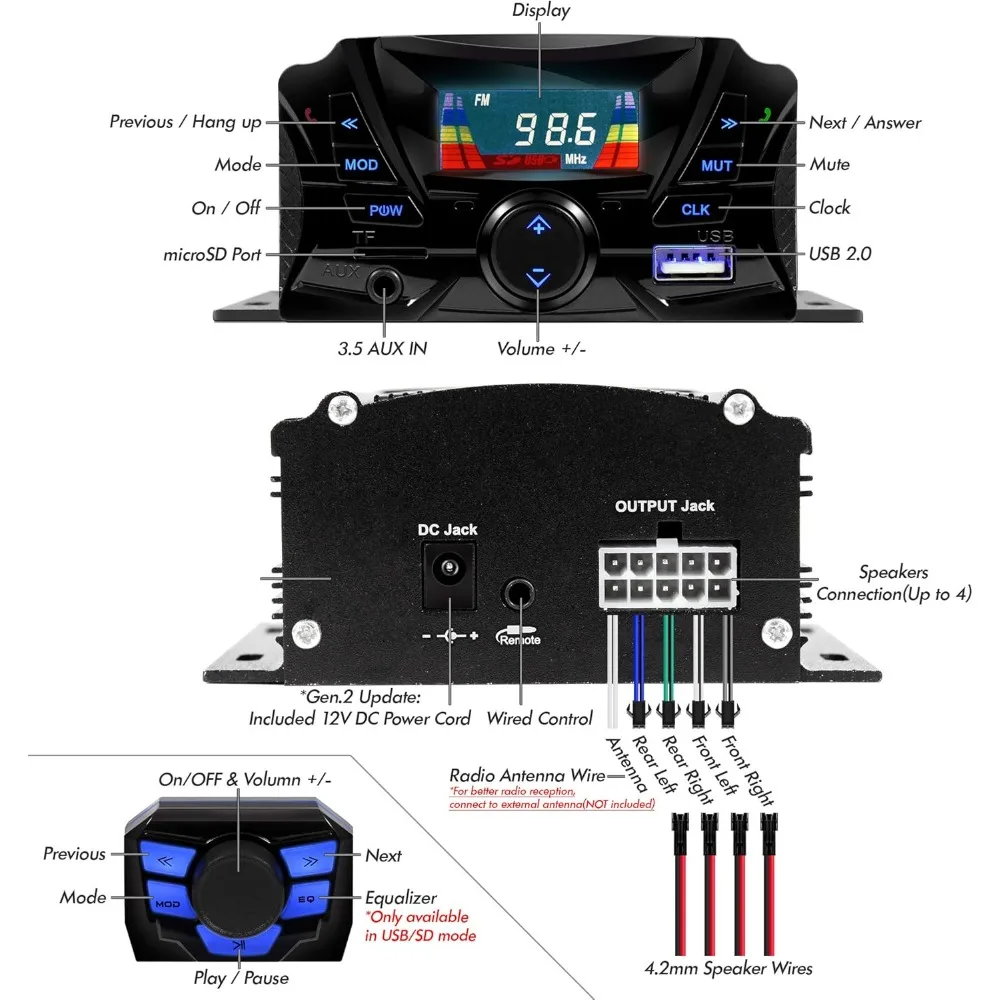 Superb Crystal Sound Quality. Advanced Waterproof Speaker(Amplifier is not waterproof). Great for outdoor use. Included Optional Mini Wired Remote Control with Blue LED Back-lit Buttons and Handlebar Clamp.
