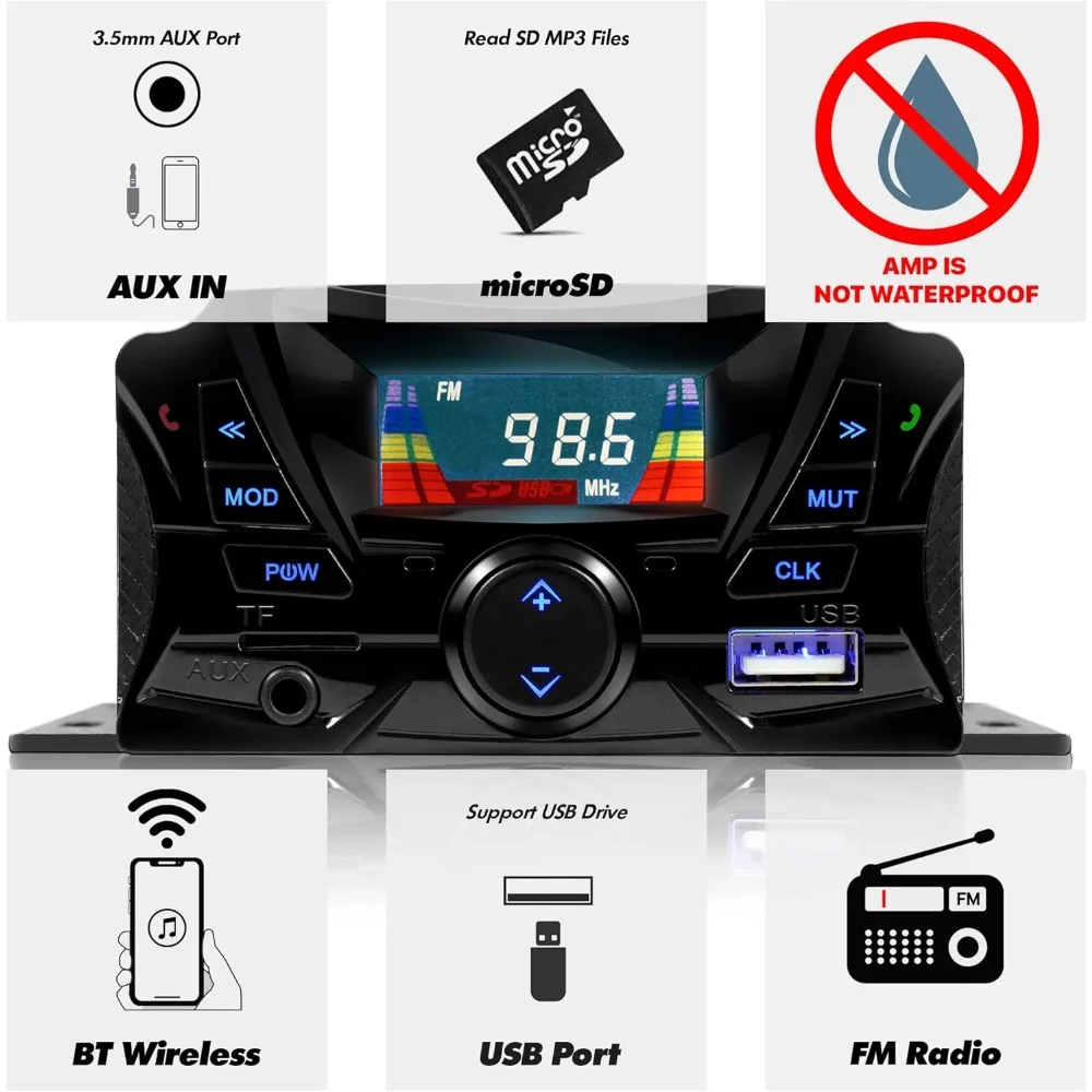 3.5mm Audio Jack AUX IN Available. Support USB and microSD Card MP3 files. FM Radio Receiver Built-in. Clock Display. Matte Black Stereo Unit Built with High Quality Aluminum Material. Perfect for Motorcycle ATV UTV Electric Bike.