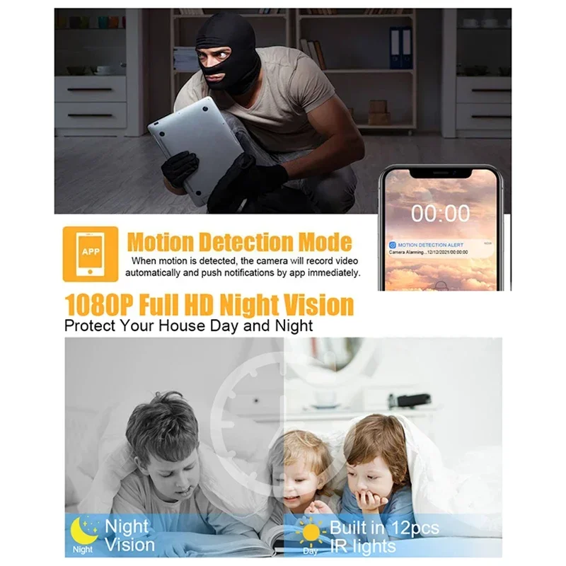 【HD 1080P Mini Home Security Wireless Camera】 Commonly used for business and home security as well as baby security surveillance camera, toddler indoor camera, pet monitor camera and used for motion detection to watch over elders.